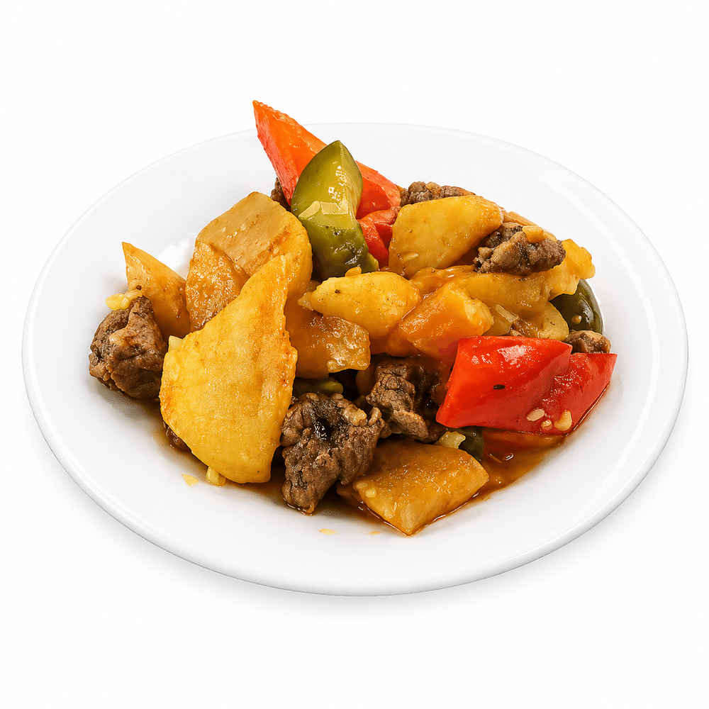 говядина, картофель, марин огурец, лук репч., болг перец, томат паста, специи