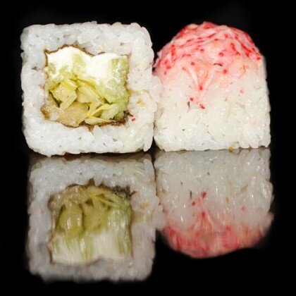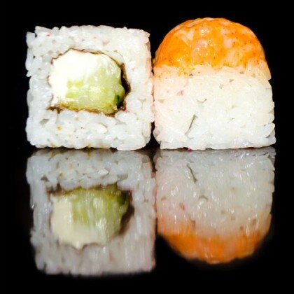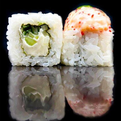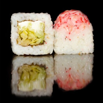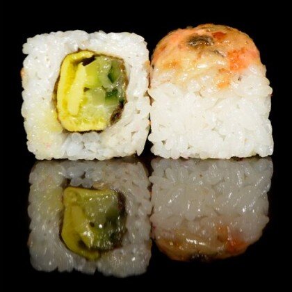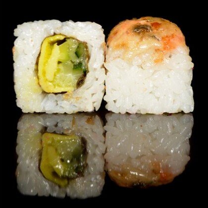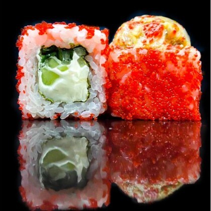 Рис, омлет, огурец, сыр творожный, креветка, соус "Спайс", тобико, сыр "Моцарелла", соус "Унаги".