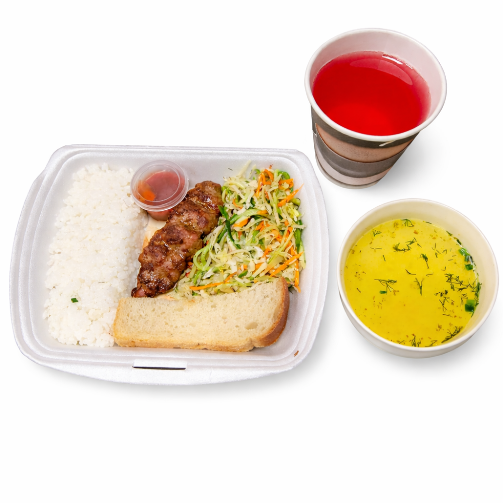 Суп куриный, люля кебаб, рис, салат, морс (компот)