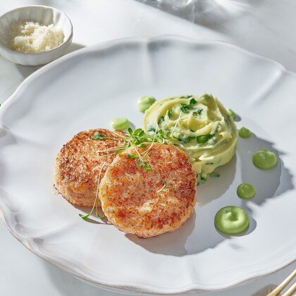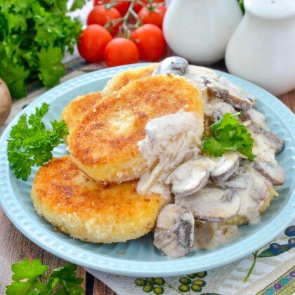 Котлеты из оленины с картофельным пюре и грибным соусом