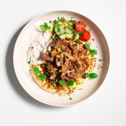 Бефстроганов из фермерской телятины c картофельным пюре и муссом из белых грибов