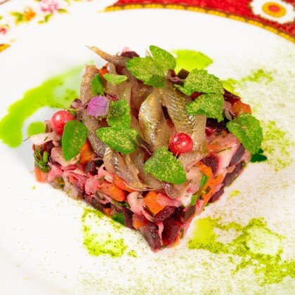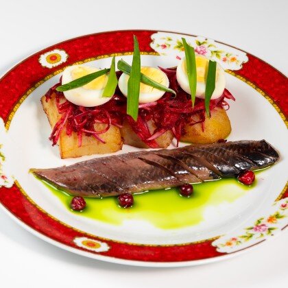 Олюторская сельдь с печеным картофелем и салатом из свеклы