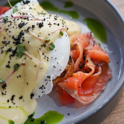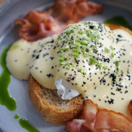 Цельнозерновой хлеб, соус голландез, ростбиф, 2 яйца пашот, семена чиа