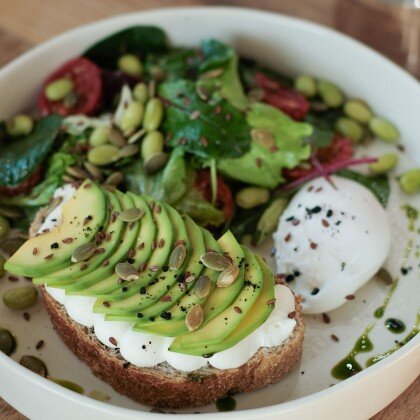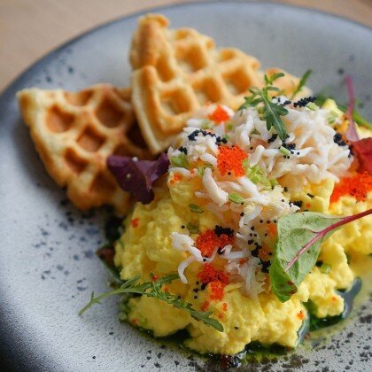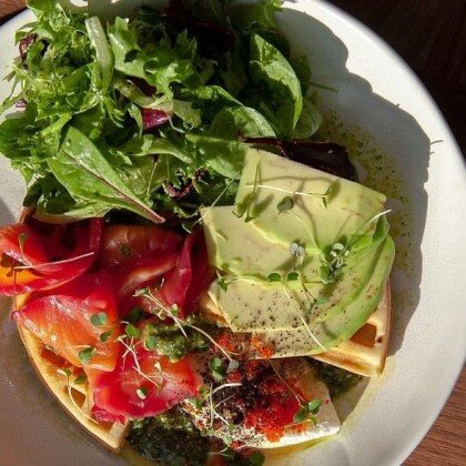 Вафли с форелью гравлакс, соусом песто, яйцом пашот, авокадо