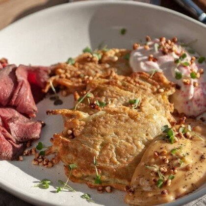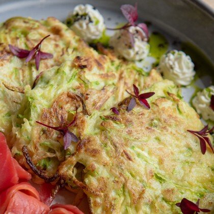 Кабачковые оладьи с лососем главракс и сырным кремом
