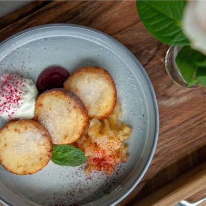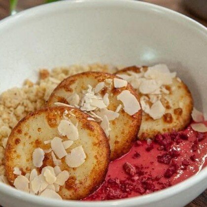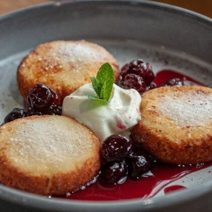 Сырники ванильные с миндальным крэмблом и малиновым соусом