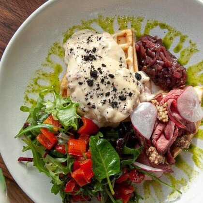 Вафли с ростбифом, яйцом пашот и луковым мармеладом