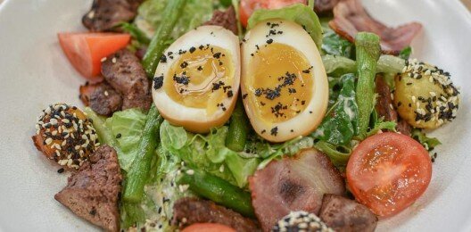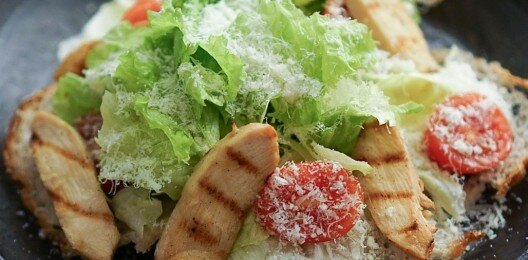 Состав: Соус на основе яичных желтков и анчоусов, листья салата, салат Айсберг, черри, пармезан, тигровые креветки, гренки