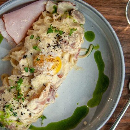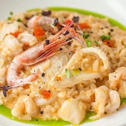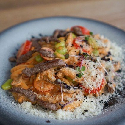 Хрупкая муза, заключённая в пылкие объятия итальянского соуса. Состав: Паста, тигровые креветки, помидоры, чеснок, перец чили, пармезан, устричный соус