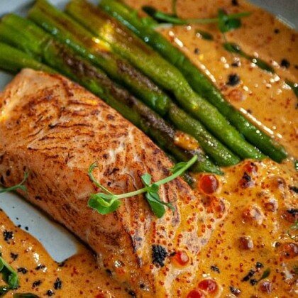 Стейк из лосося с сливочным соусом, красной икрой и спаржей