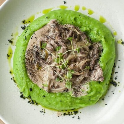 Бефстроганов из говядины с картофельным пюре и соусом песто