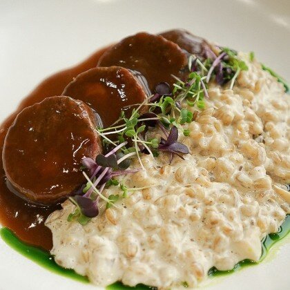 Говяжьи щечки в соусе демиглясс с перловой кашей