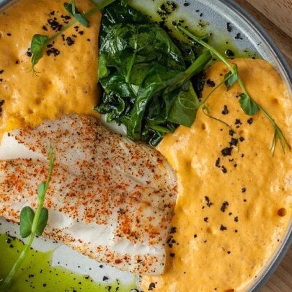 Нырок в источник сливочной нежности, открывающий двери в новое измерение Состав: Форель су-вид, спаржа, сливки, соус биск, икра лосося, икра тобико.