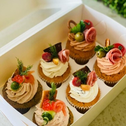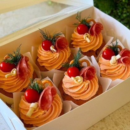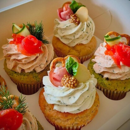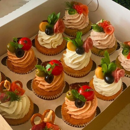 кекс с беконом, чоризо и луком, сливочно-сырный крем с горчицей