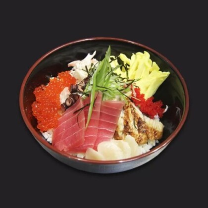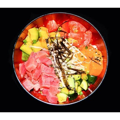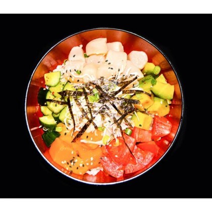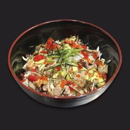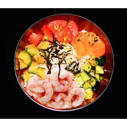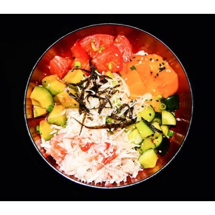 Рис, соевый соус, форель, капуста, огурец, помидор, чука, манго, кунжутное семя, зелень, Васаби, соус Сябу, соус Бульдог