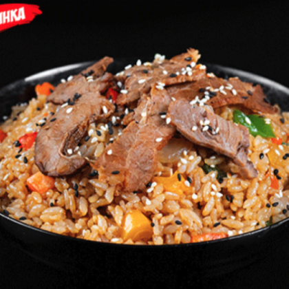 Рис, курица, морковь, перец болгарский, лук репчатый, яйцо, кунжут, лук зеленый, соус "устричный"