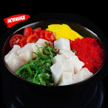Рис, гребешок, тофу, огурец, кукуруза, морковь, помидоры, соус "ореховый"