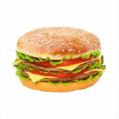 Булка белая с кунжутом, сыр, котлета говяжья, фирменный соус "Терияки", овощи, жаренный бекон.