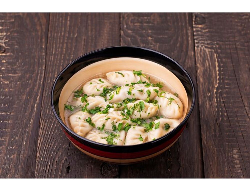 Наваристый говяжий бульон и домашние пельмени ручной лепки.