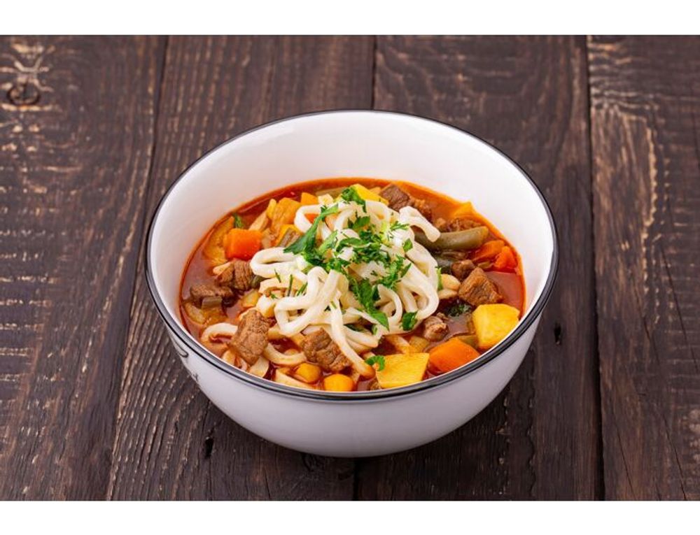 Острый суп с говяжьим филе, овощами (лук, морковь, перец) и домашней яичной лапшой.