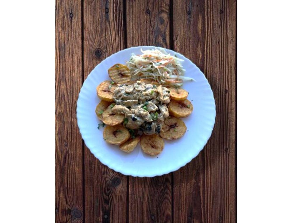 Филе куриное в сливочном соусе с грибами, подается с жаренным картофелем и овощным салатом.