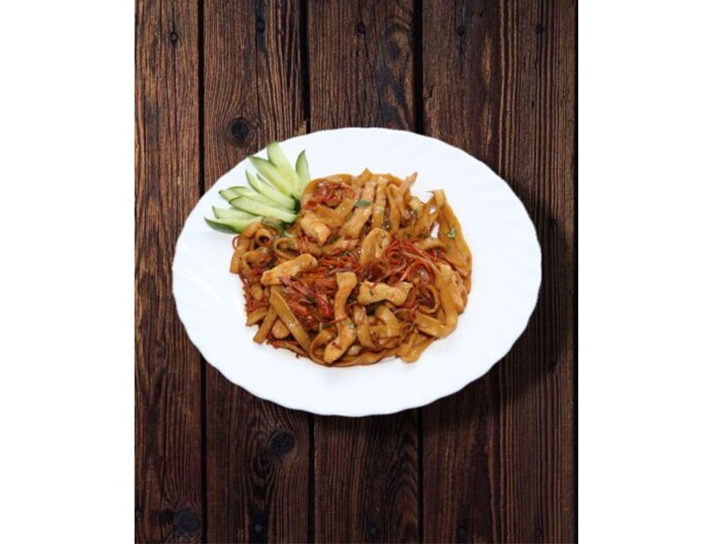 Яичная лапша собственного приготовления, обжаренная в соево-чесночном соусе с курицей и овощами, украшается свежим огурцом.
