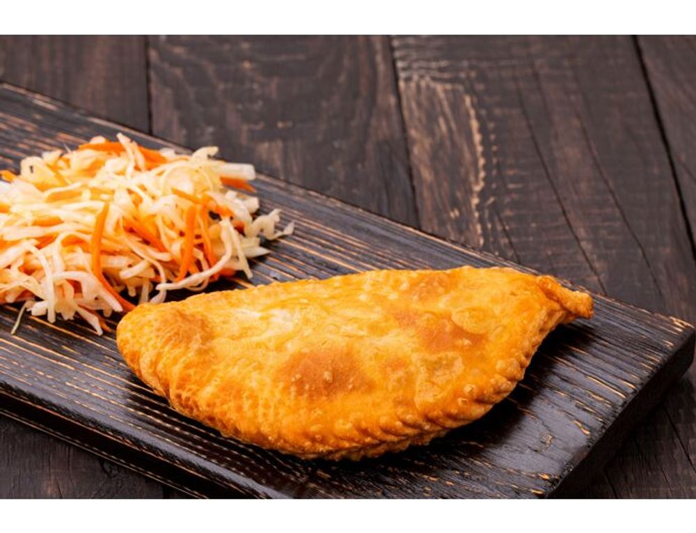 Хушуур с начинкой из говядины и свинины с салатом из капусты.