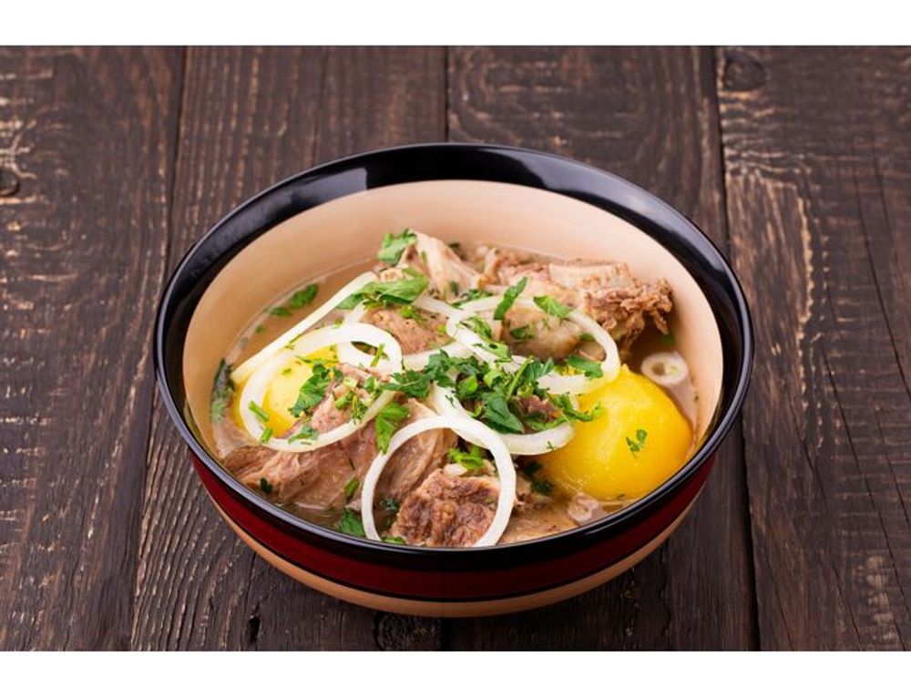 Наваристый суп с бараниной и картофелем, украшенный луком и зеленью.