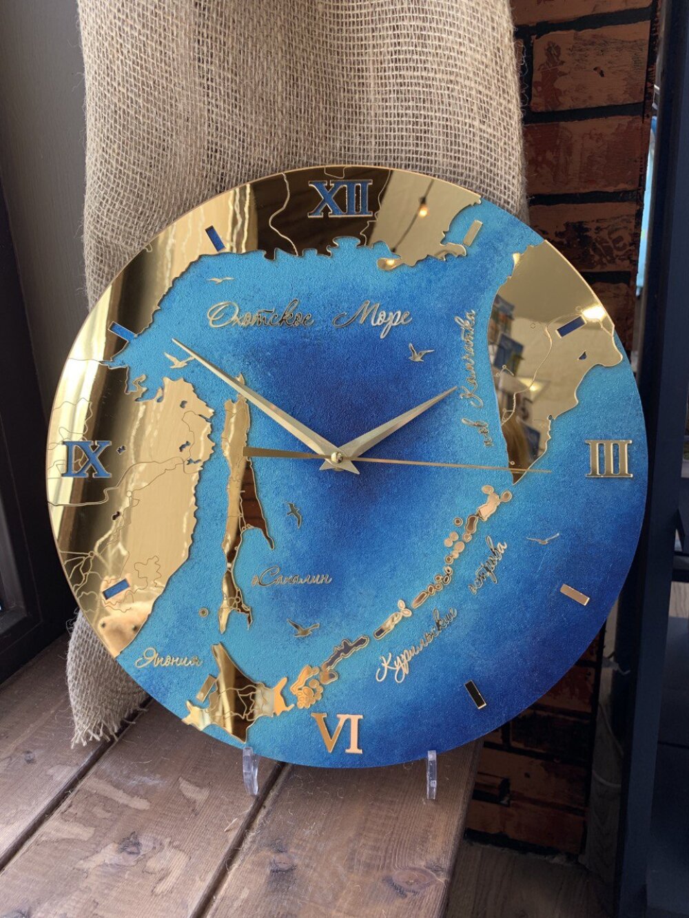 Фон: морская гладь создается акриловыми красками, с добавлением перламутра. Данный эффект добавляет часам сияние.