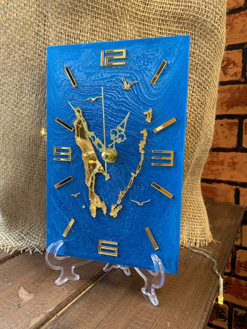 Главный акцент — силуэты Сахалина и Курильских островов, выполненные из зеркального акрила. Цифры и метки циферблата также вырезаны из зеркального акрила. Они перекликаются с островами, объединяя композицию в единое целое.