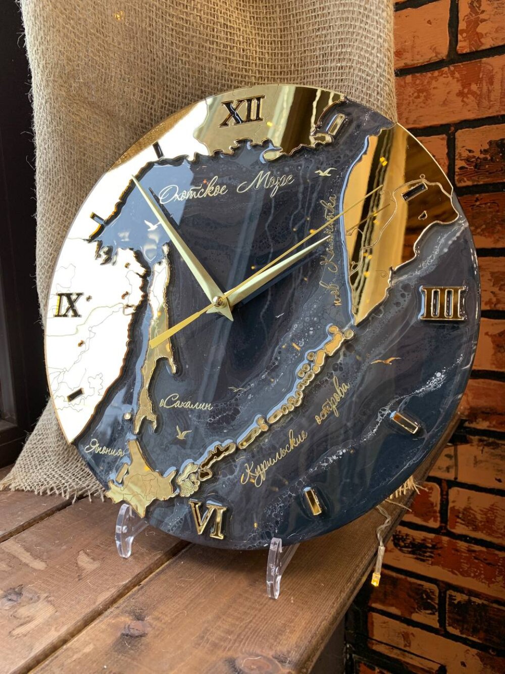 часы залиты эпоксидной смолой. Поверхность становится твердой, идеально ровной, прозрачной и глубокой, как стекло. Такие часы выглядят более объемными и эффектными.